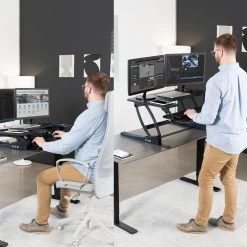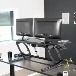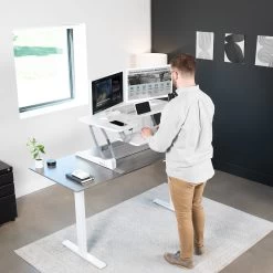 Improve your work experience with our extra-wide electric tabletop desk. This dual-tiered platform sits on top of your current desk and gives you the benefit of standing or sitting throughout the long work day. This provides numerous health benefits for the body such as increased blood flow and reduced aches and pains. –Patented–