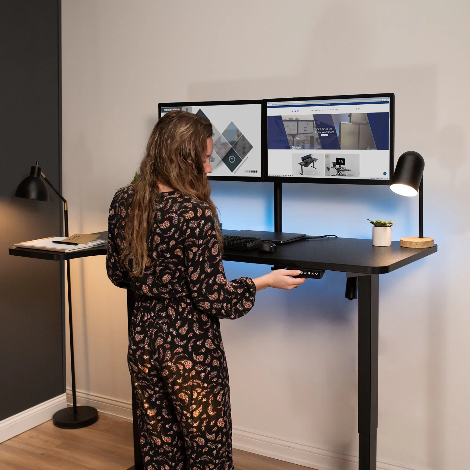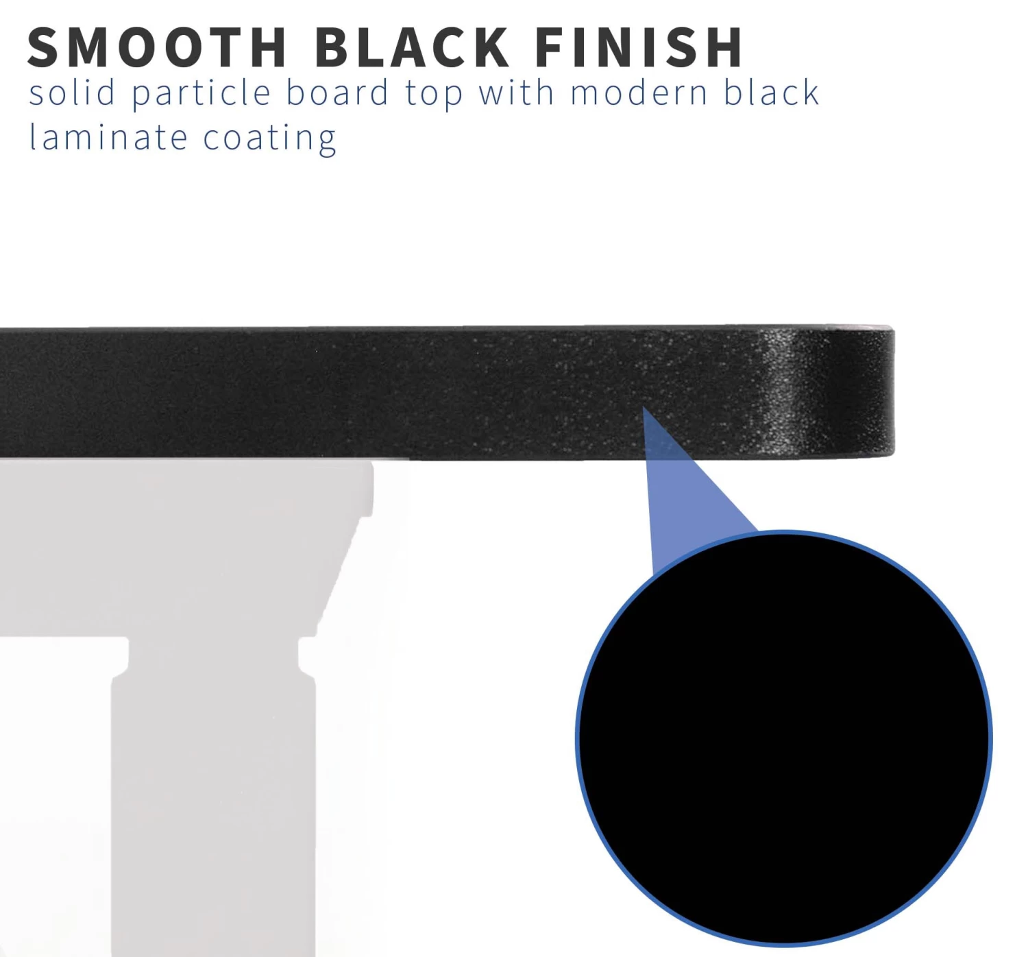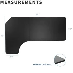 Find the perfect table top solution for your standing desk frame with this corner desktop! Featuring 2 sturdy sections of particle board in a modern black color, this product provides the finishing touch to your adjustable workstation with a reversible corner design! Go from sitting to standing with your equipment and accessories safely resting on this spacious surface. Compatible with both manual and electric frames measuring 38” to 57” in length, this table top gives you options!