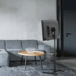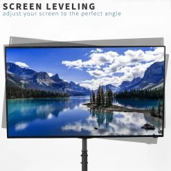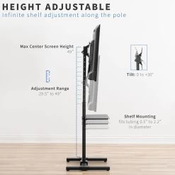 Enhance your visual display with the height adjustable Black TV Stand with Storage Shelf that holds the majority of flat screens from 13″ to 50″ in size. Features include telescoping height adjustment, screen tilting capability, and a utility shelf that conveniently stores your devices.
