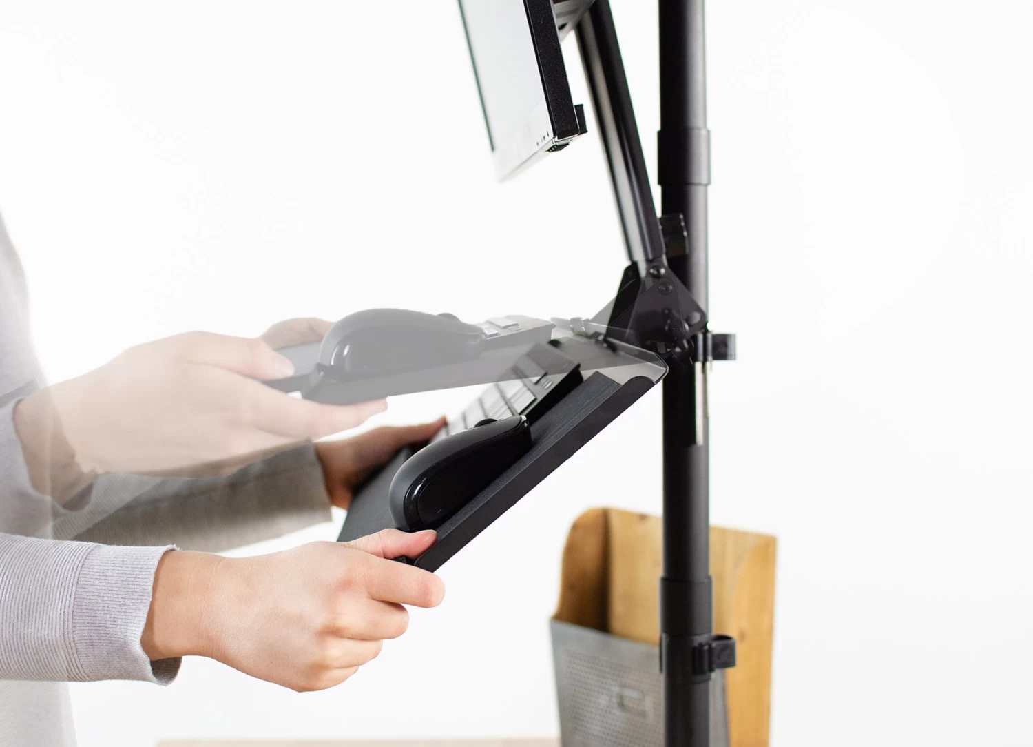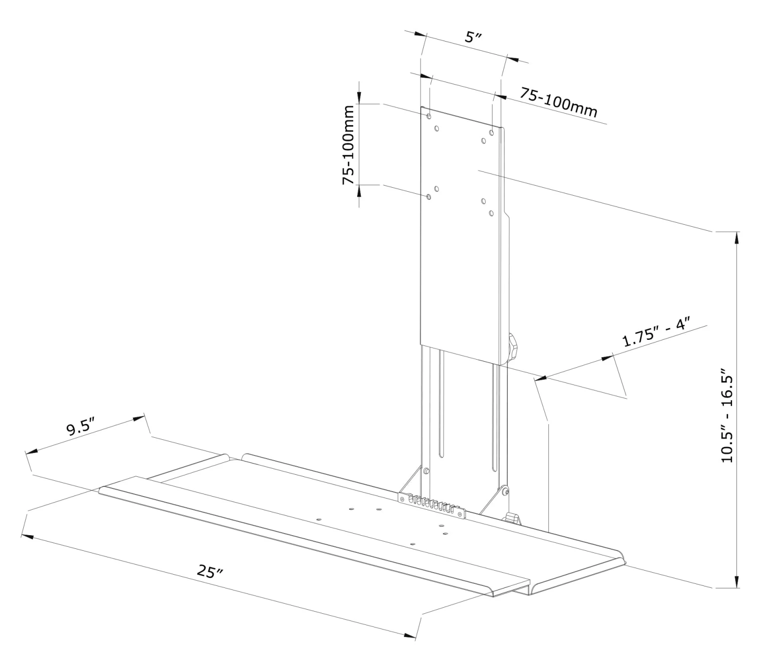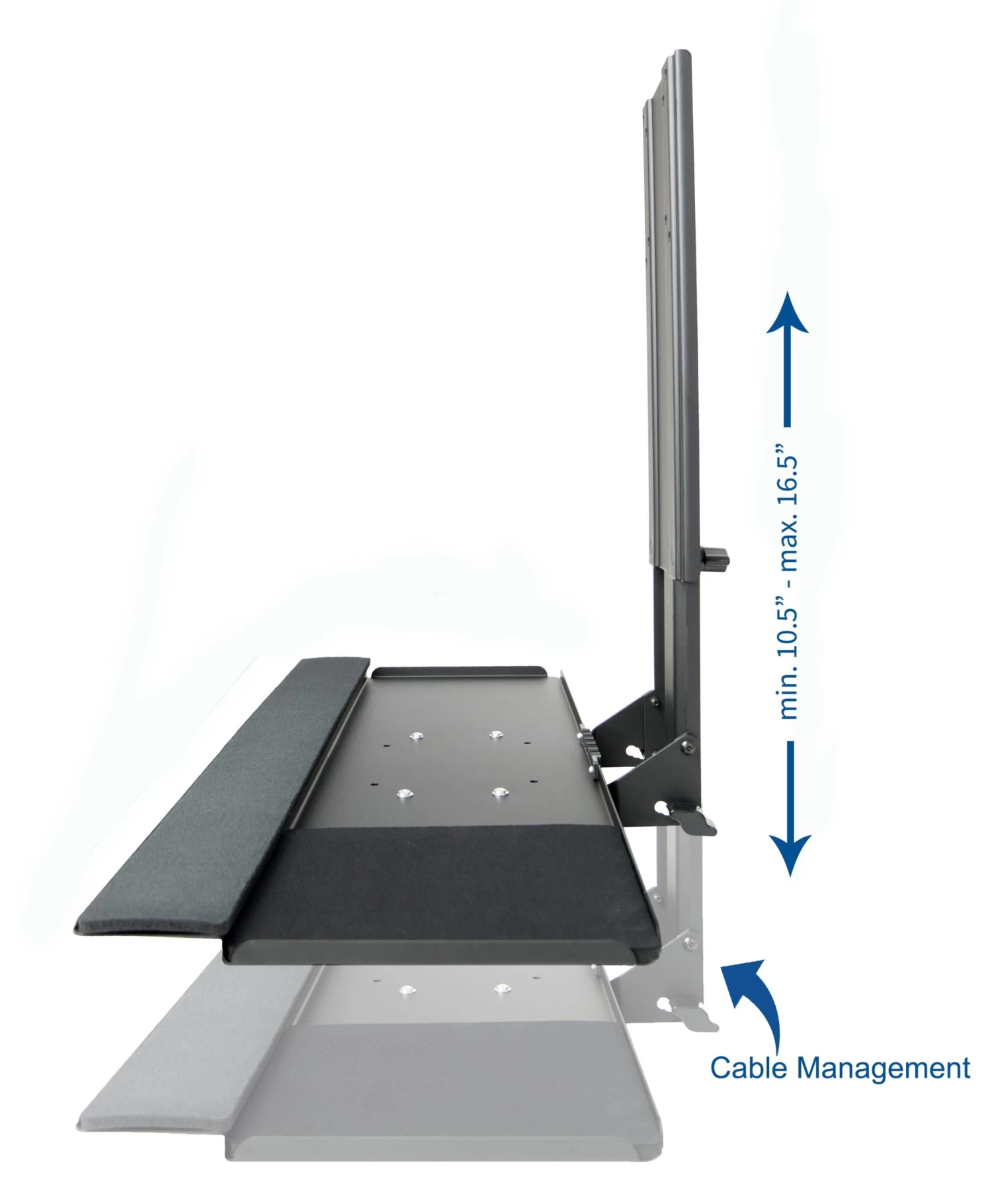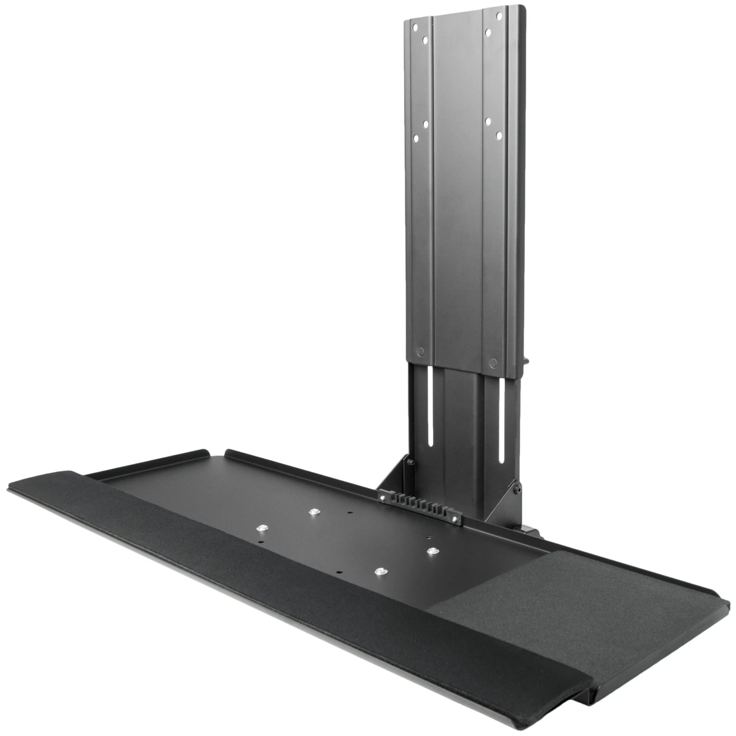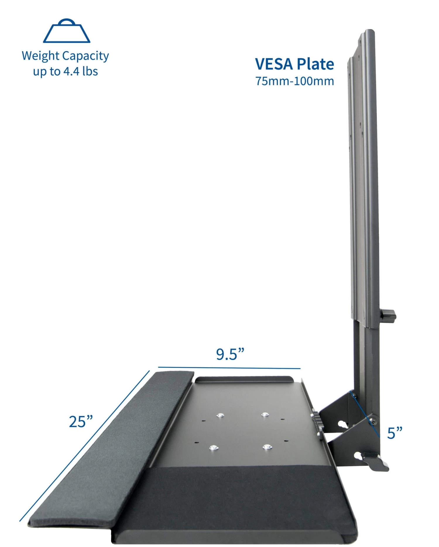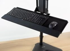 MOUNT-KB02 is a VESA keyboard tray attachment from VIVO designed to connect to your monitor mount behind the monitor with the tray sitting directly underneath. Features include adjustable height and tilt for ergonomic positioning. The front lip features plush padding for wrist comfort and the included mouse pad can be placed on either side for left or right-hand use. Works great in combination with wall mounts to create a standing workstation. Perfect for office workspaces, reception areas, home offices, and more.