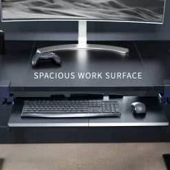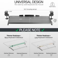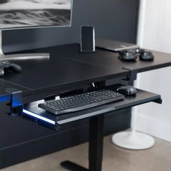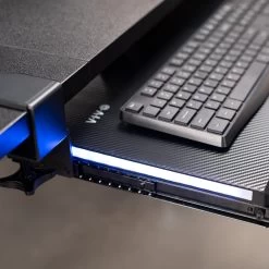 Win back valuable desk space and add RGB flare to your setup by adding a lower-tier surface for the keyboard, mouse, and other small items. Vibrant LED strips line the sides of the keyboard tray, cycling through powerful RGB colors with breathing motion effects. Featuring USB connectivity, easily power your LED tray through your laptop, PC, or A/C wall unit (not provided). This stylish LED keyboard tray features smooth gliding tracks for easy movement and solid C-clamps with anti-skid padding for damage-free installation. –Patent Pending–