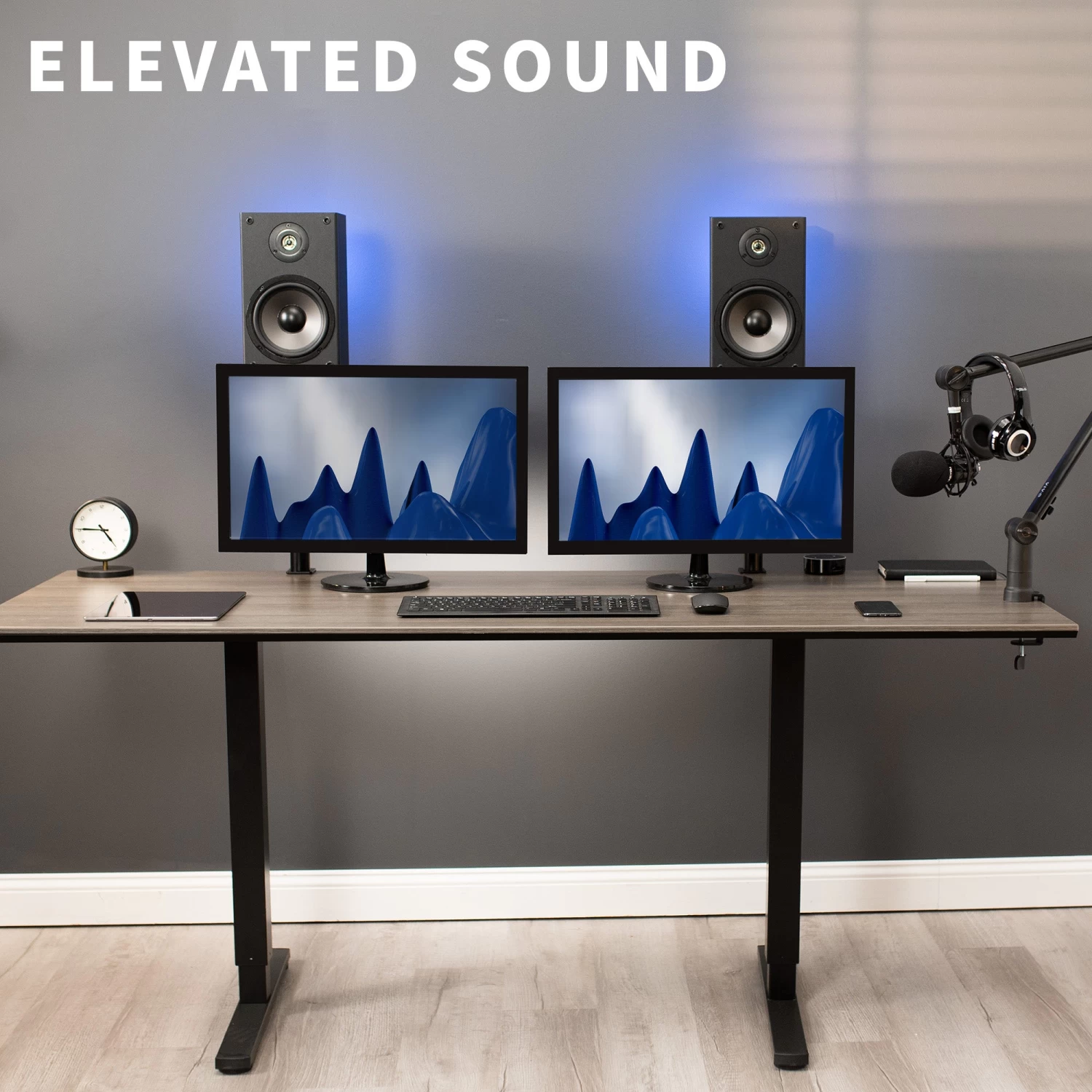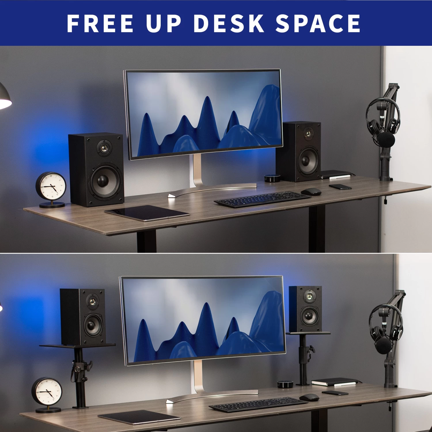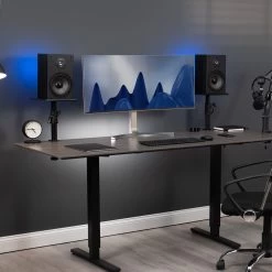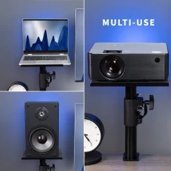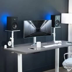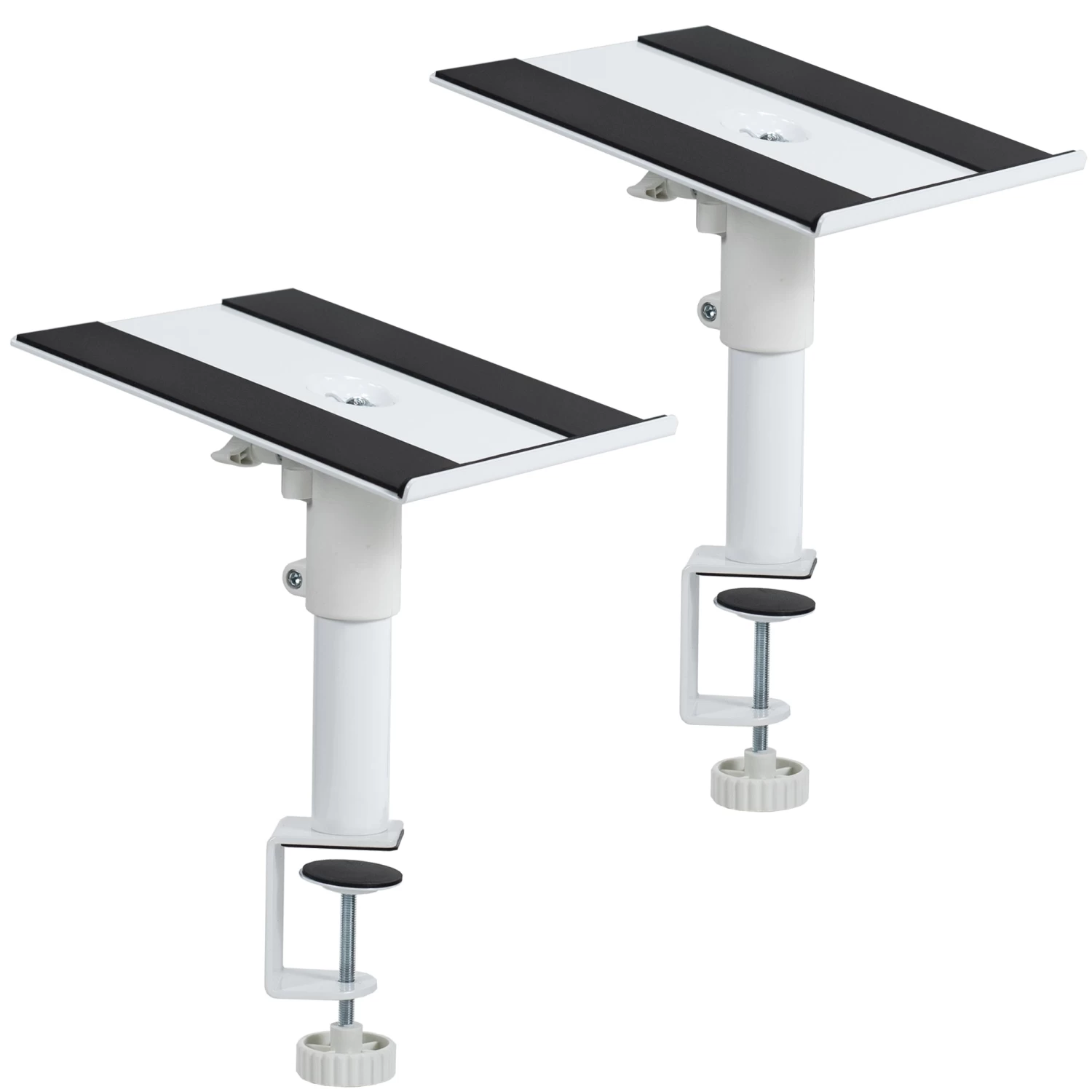 Elevate your speakers with Black Clamp-on Speaker Stands. These solid steel studio mounts are designed to easily clamp onto your desktop, providing an elevated platform for your speakers or surround sound system. Adjustable height settings create the perfect position for your setup, raising your speakers for greater sound clarity.