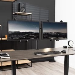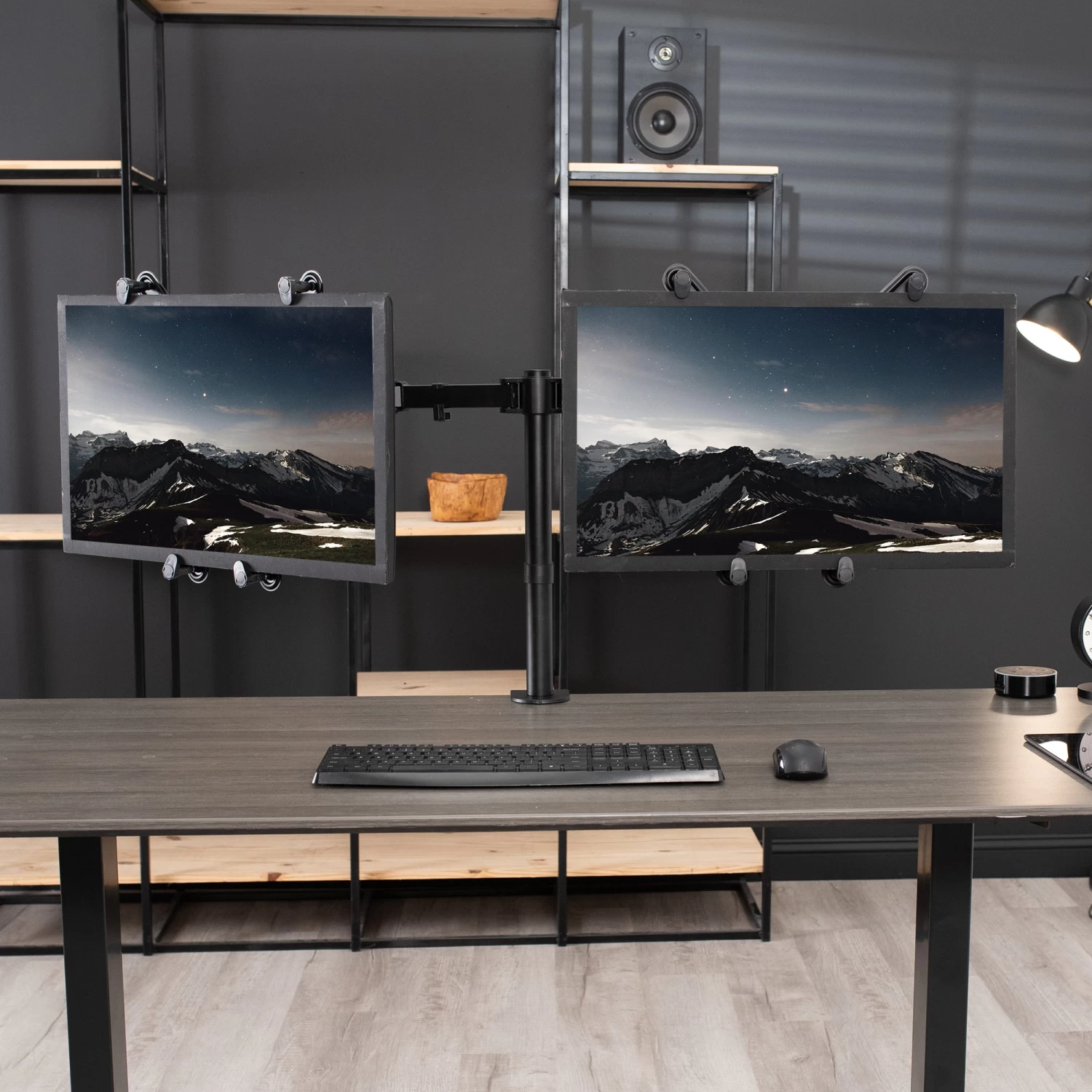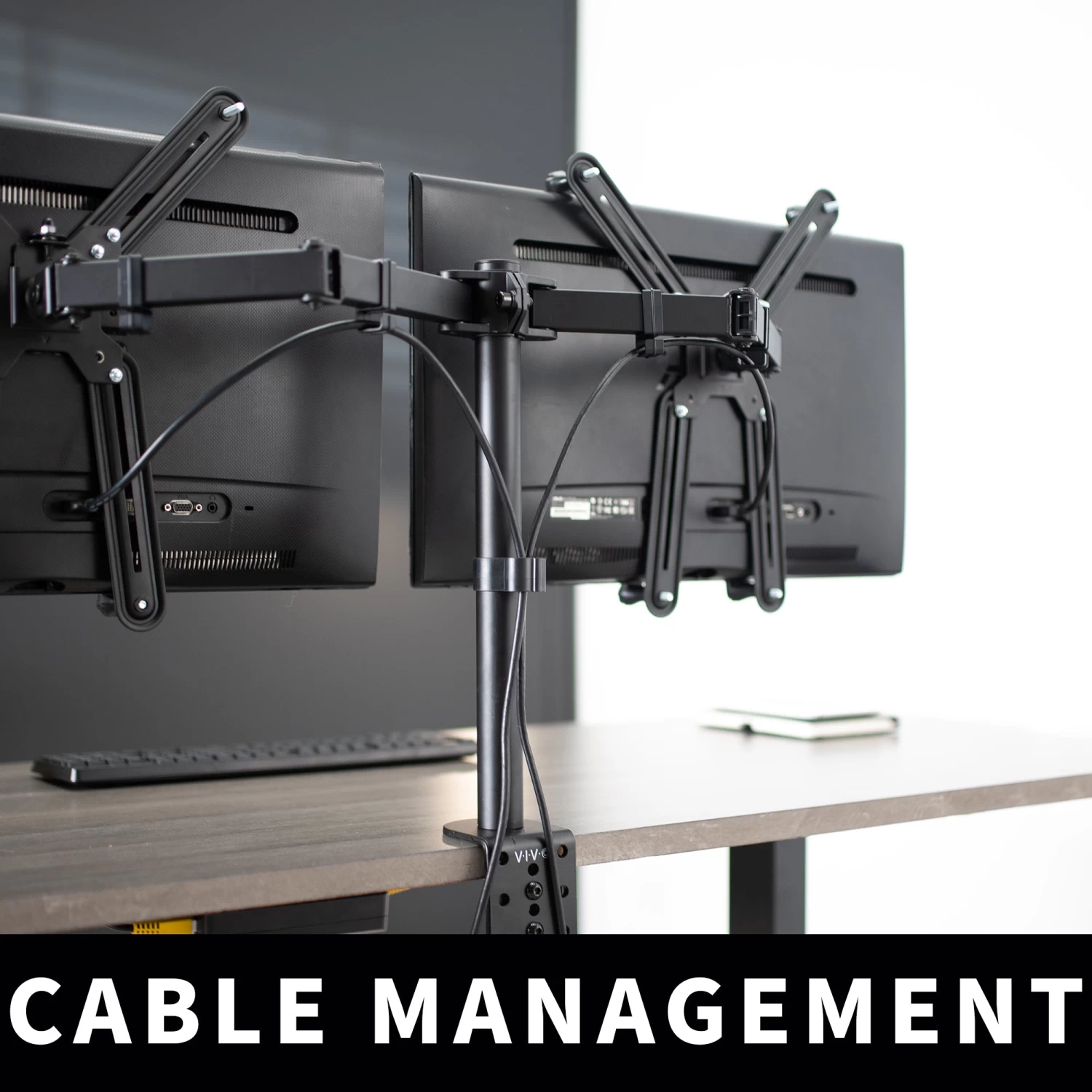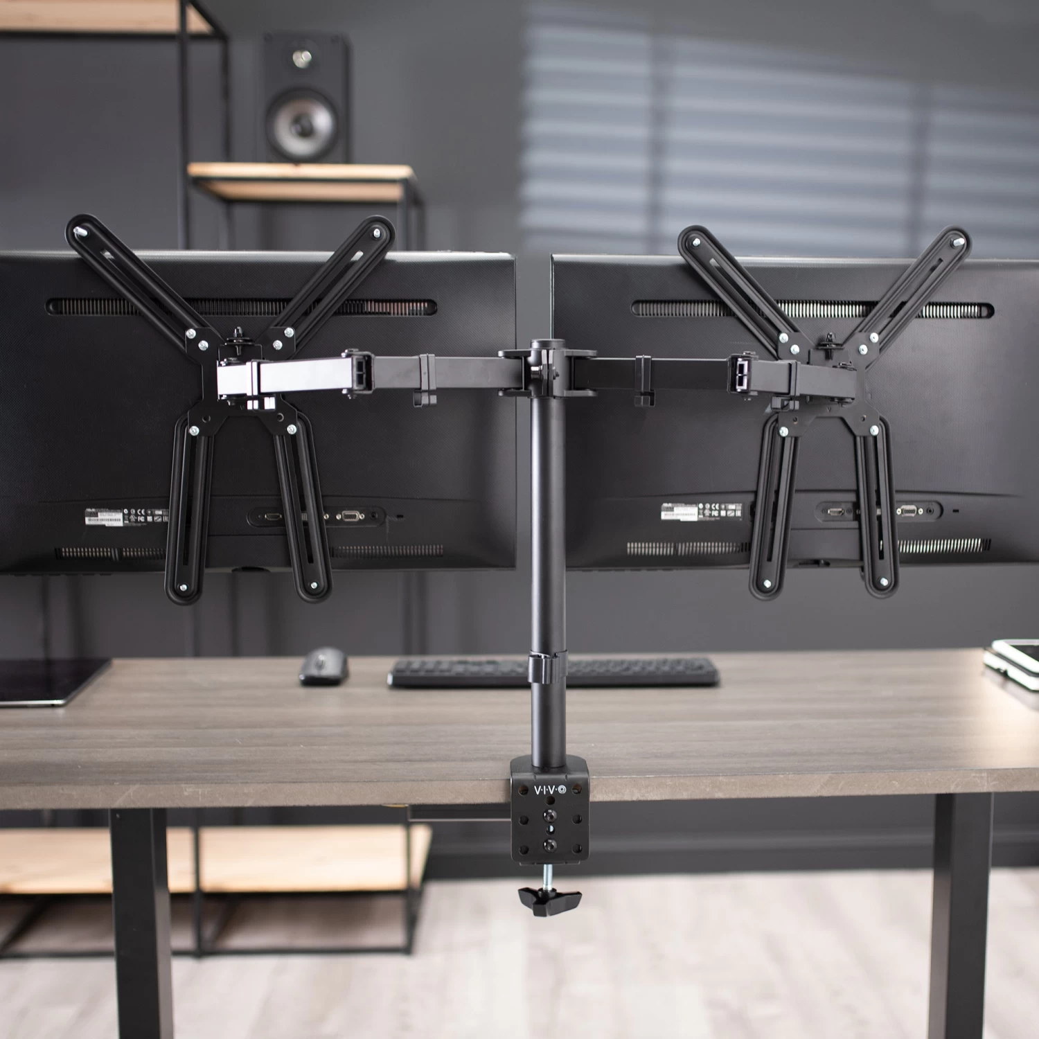 Designed for monitors lacking VESA compatibility, this double-screen clamp-on monitor stand includes VESA adapters that wrap around the edges of your 13” to 27” screens, providing a solid hold with padded side hooks for added stability. The adapters are compatible with screens weighing up to 17.6 lbs each and include additional padding to securely hold slimmer monitors. The stand clamps to desktops up to 3.25” thick and offers +90° to -90° tilt, 360° swivel, and +5° to -5° screen leveling for comfortable viewing angles and glare reduction. Save valuable desk space and enjoy the ergonomic benefits of a VESA mount without VESA-compatible screens.