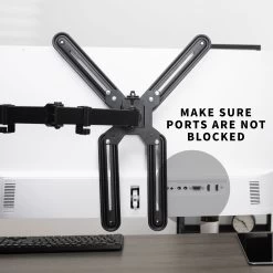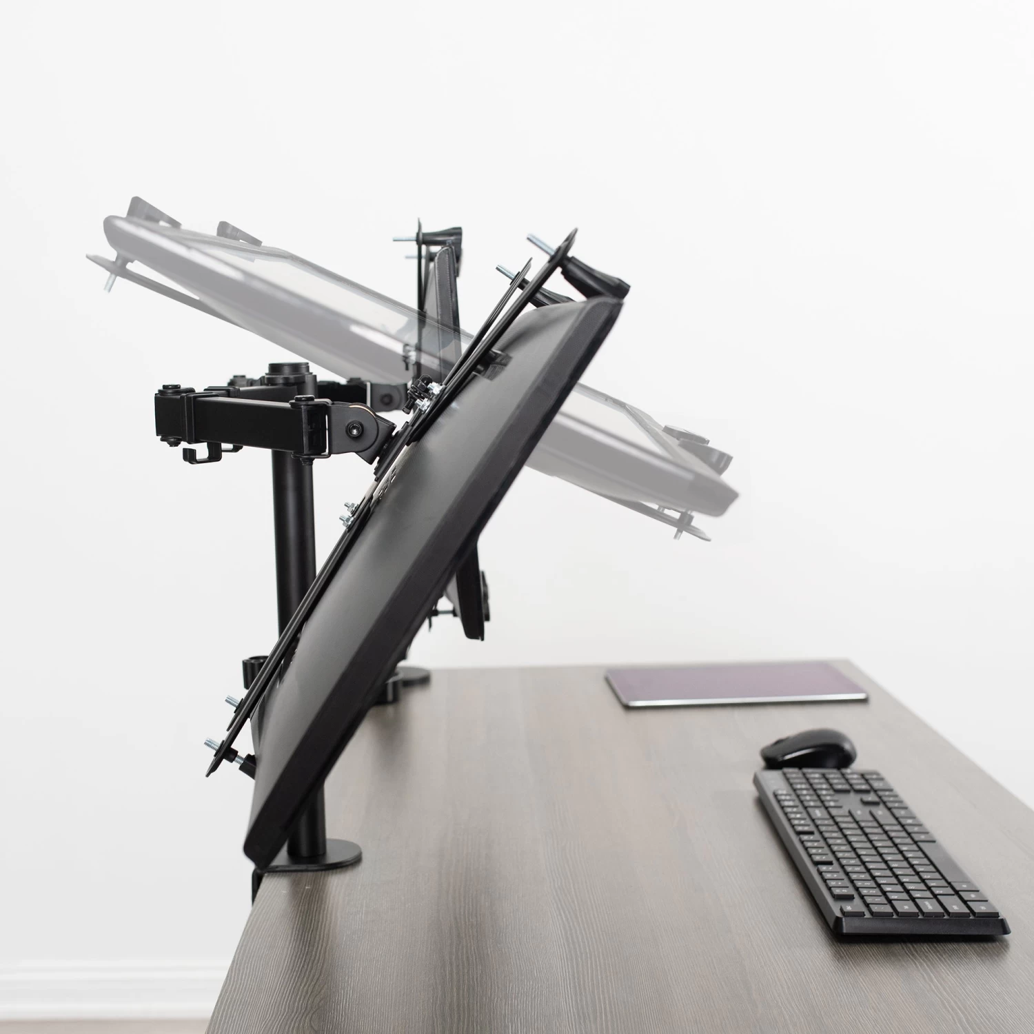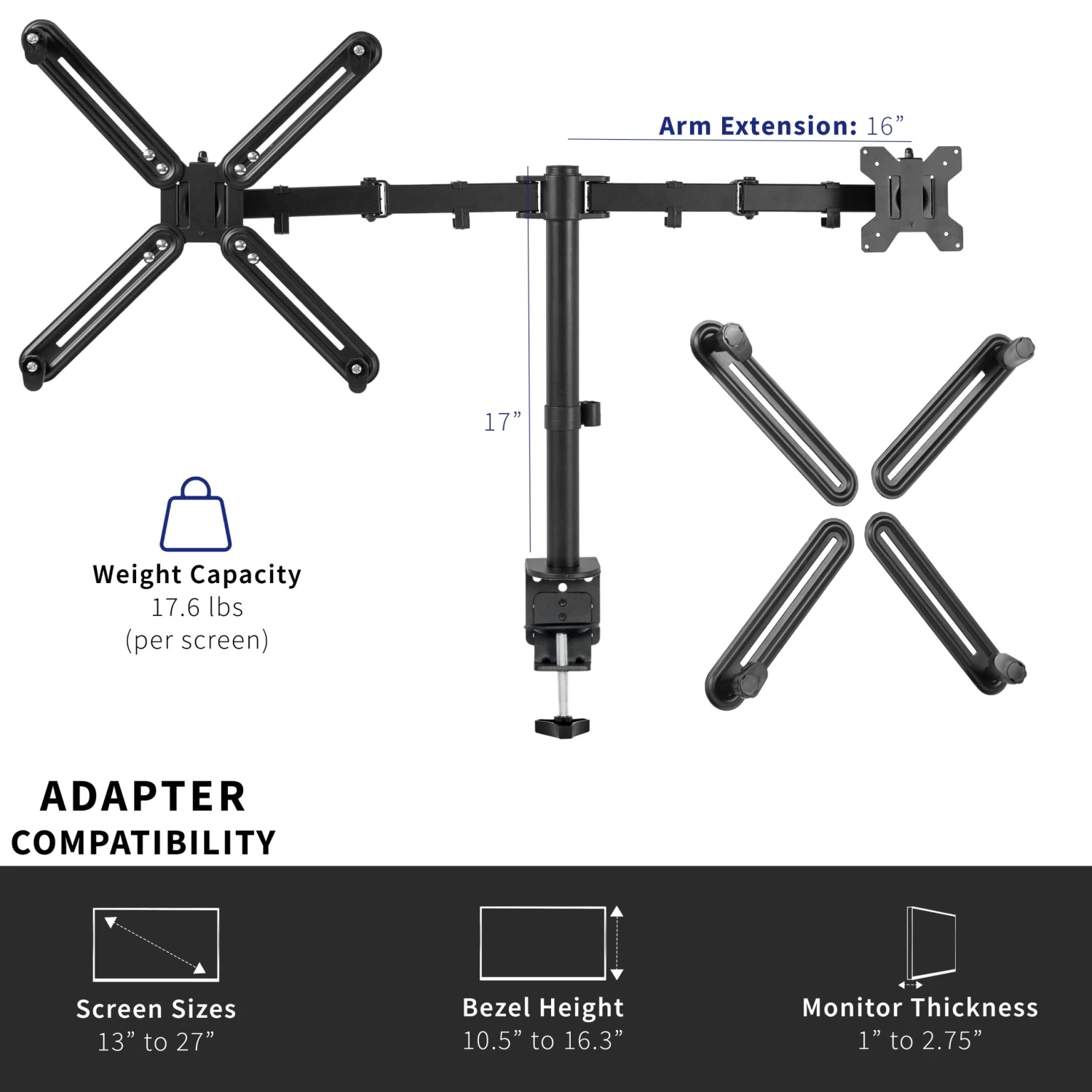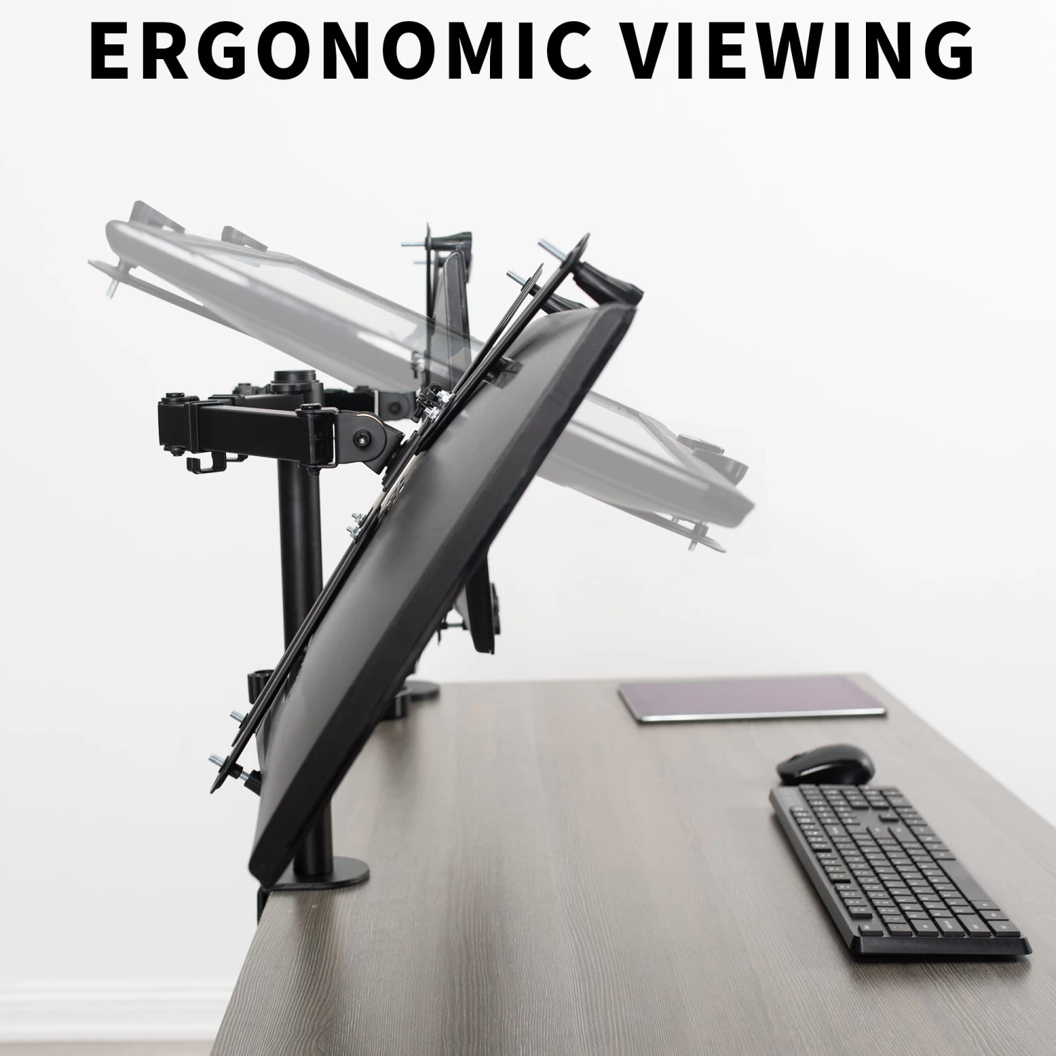 Designed for monitors lacking VESA compatibility, this double-screen clamp-on monitor stand includes VESA adapters that wrap around the edges of your 13” to 27” screens, providing a solid hold with padded side hooks for added stability. The adapters are compatible with screens weighing up to 17.6 lbs each and include additional padding to securely hold slimmer monitors. The stand clamps to desktops up to 3.25” thick and offers +90° to -90° tilt, 360° swivel, and +5° to -5° screen leveling for comfortable viewing angles and glare reduction. Save valuable desk space and enjoy the ergonomic benefits of a VESA mount without VESA-compatible screens.
