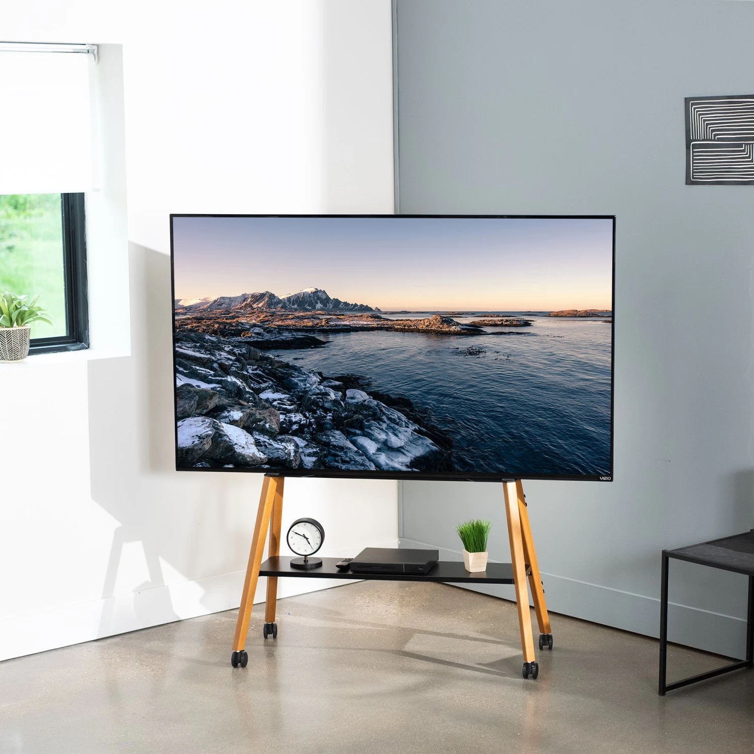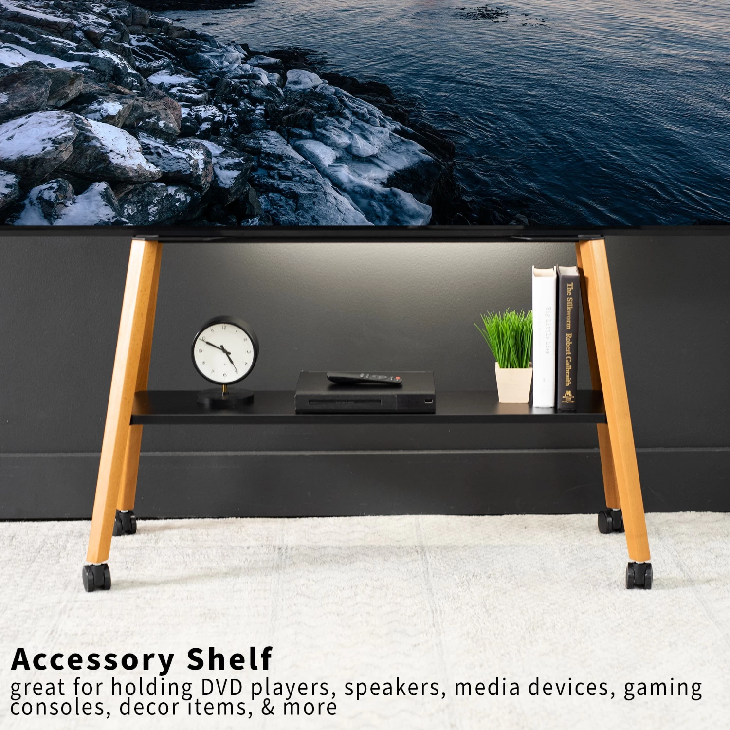 Be the first to review “Mobile Easel Stand With Shelf For 49” To 75” TVs” Cancel reply