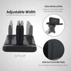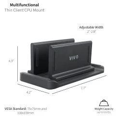 With an adjustment range from 0.2” to 2.8”, this multifunctional mount is made to hold the thinnest CPU’s on the market. Designed for the Mac Mini, docking stations, thin clients, and more. Reinforced with padded side walls, it secures your PC in place while still allowing easy access to necessary ports and more. This holder can be mounted to the back of your monitor with OEM stand, secured between the monitor and VESA arm, and used as a freestanding desk holder to help declutter your workstation.