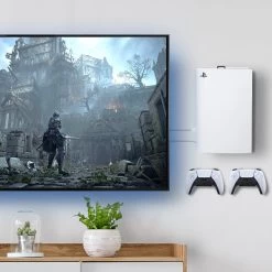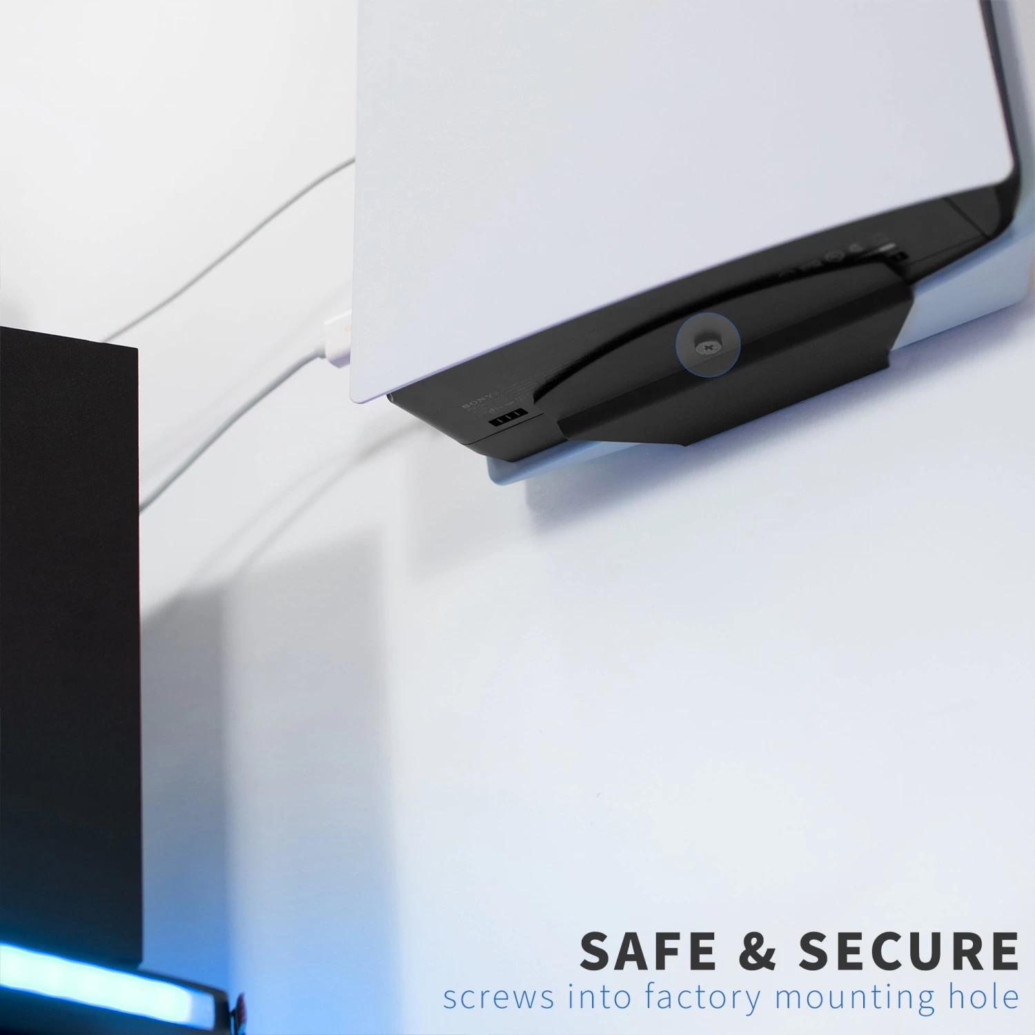 This versatile mount will hold your PlayStation 5 in a safe, convenient location. The bracket design supports vertical orientation, and mounting hardware is included for wood stud and drywall installation. The open design keeps your PS5 from overheating, and a security bolt and support brackets provide maximum protection. –Patent Pending–
