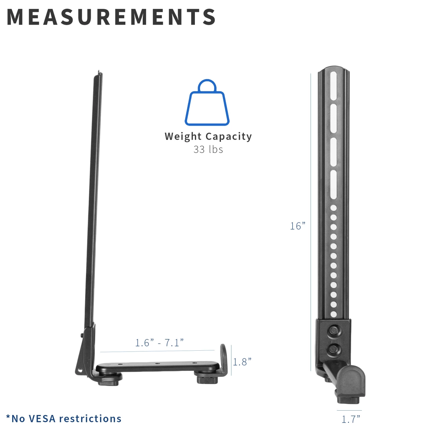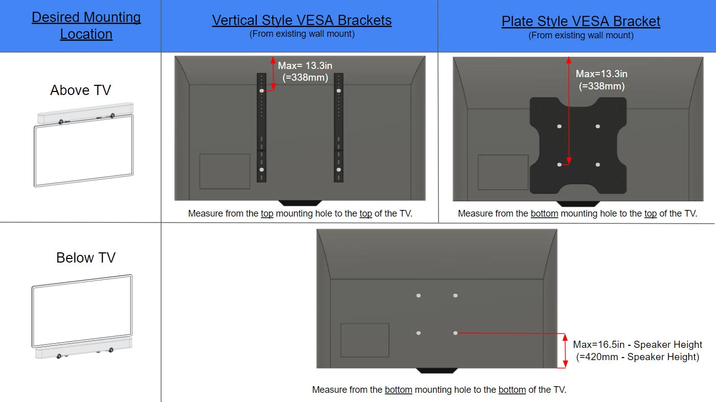 Ideal for both home and business use, these brackets mount securely to the VESA patterns on the back of your wall-mounted TV, displaying your speaker directly above or below the screen for enhanced sound. The adjustable bracket design fits most soundbars, center channel speakers, and MTM speakers on the market.