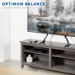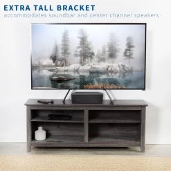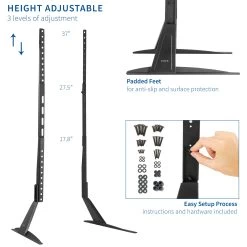With 3 height settings and a durable sleek design, this stand will keep your TV safe and secure in style. The padded feet work on desktops, table tops, dressers, and more! There is even room underneath a small to midsize screen for a center channel or soundbar speaker. Boasting more stability than original stands coming with flat screens today, this solid base holds up to 110 lbs with optional anti-tipping cable support. The brackets are simple to attach and come with all the necessary hardware to get your flat screen mounted in no time! –Patent Pending–