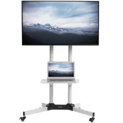 Our Mobile high-grade steel TV Cart is perfect for conference rooms, classrooms, or rolling around your home. This solid cart features a clean internal cable management system, 4 locking casters on the wheels to make the cart stationary, and an adjustable front metal shelf holding up to 10lbs.Â