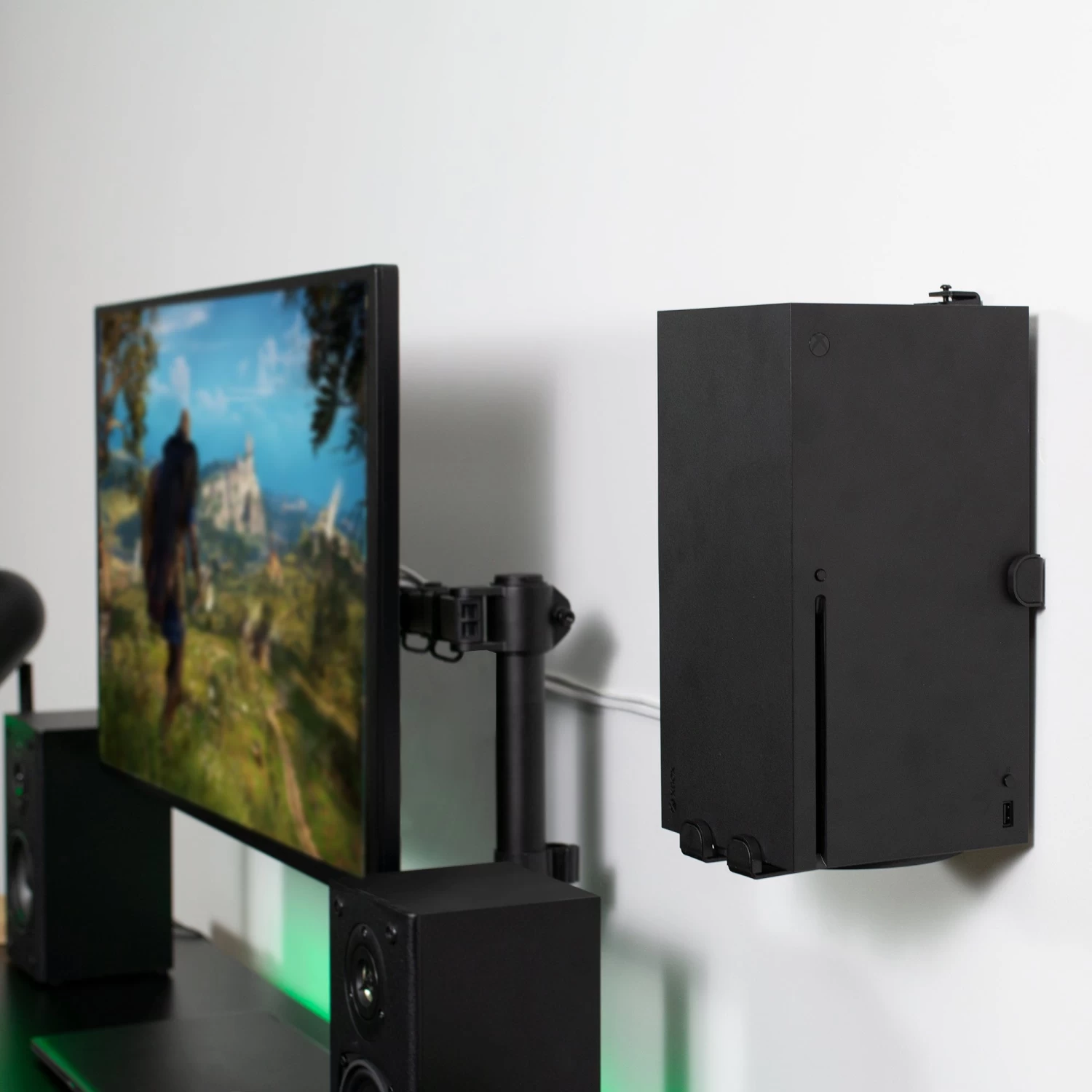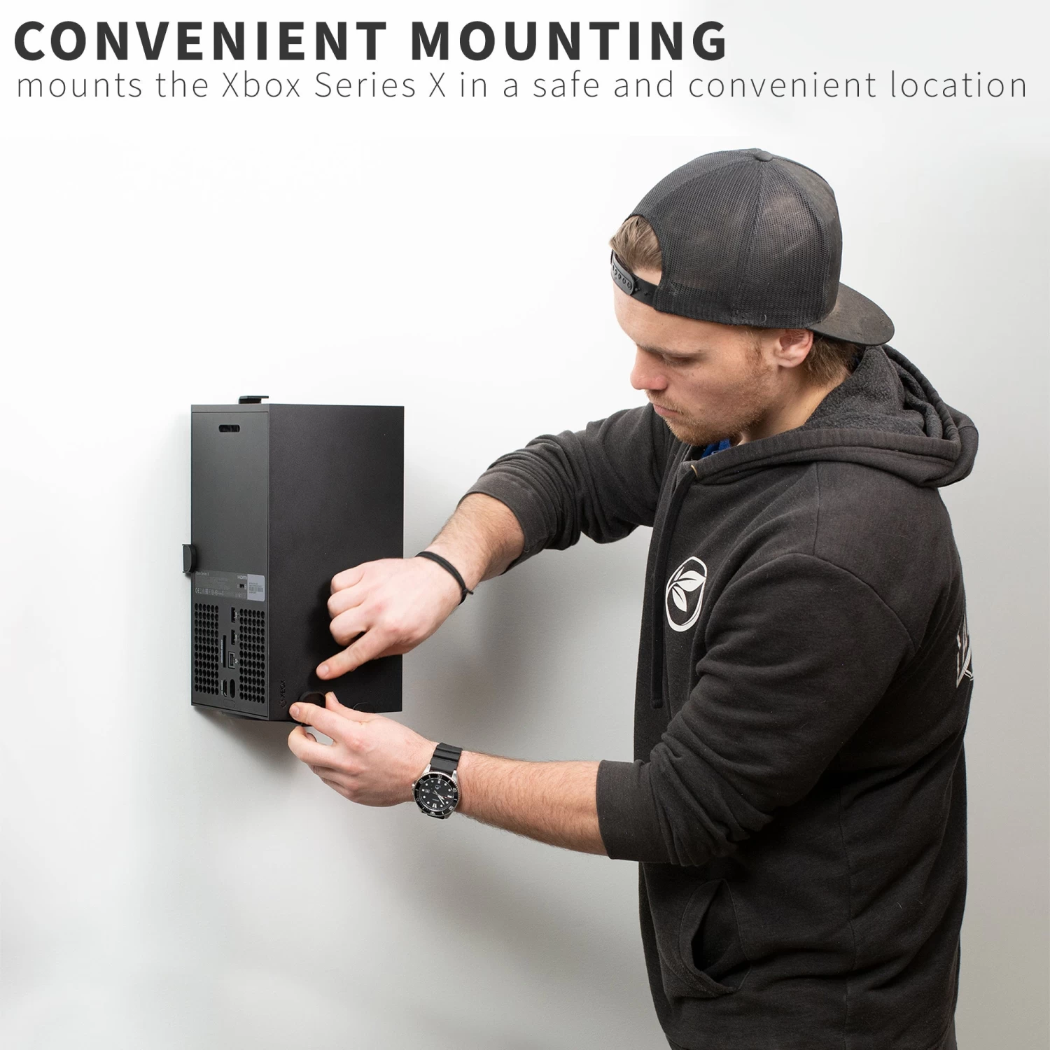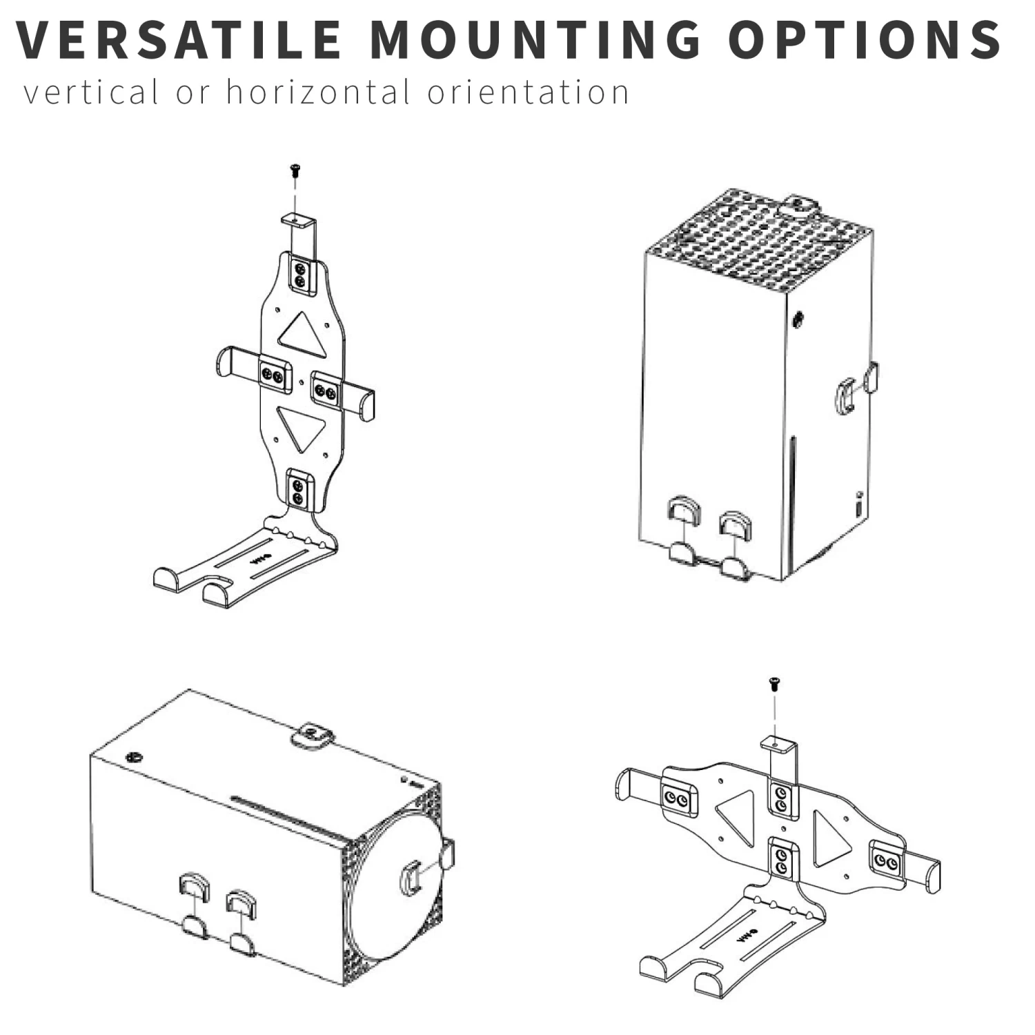 Customize your gaming setup with this high-grade steel mount that holds your Xbox Series X in a safe, convenient location for all your gaming adventures. The bracket design supports both horizontal and vertical orientation, and mounting hardware is included for wood stud, drywall, and under-desk installation. –Patent Pending–